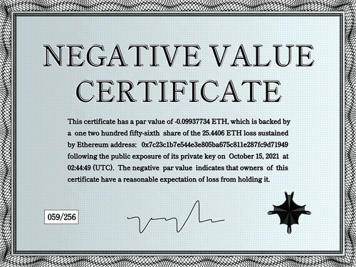 Critically examining crypto’s speculative nature and promise of value, Negative Value Certificates are “backed by loss”, with each certificate claiming to represent a negative par value of -0.09937734 ETH, as a result of the public exposure (and subsequent loss) of a private key containing 25.4406 ETH.